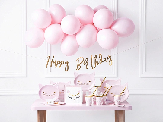 Set obsahuje: růžové balónky 12 ks, baner Happy Birthday 1ks, kelímky 6ks, ubrousky 20ks, brčka 10ks a talířky 6ks.