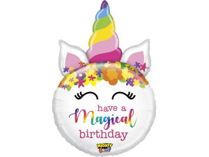 Foliový balónek ve tvaru hlavy jednorožce s nápisem Měj kouzelné narozeniny.