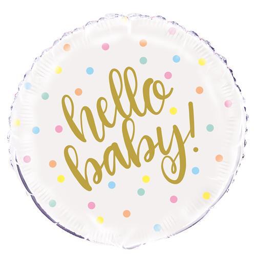 Fóliový balónek ve tvaru kruhu se zlatým potiskem Hello baby! a barevnými puntíky.