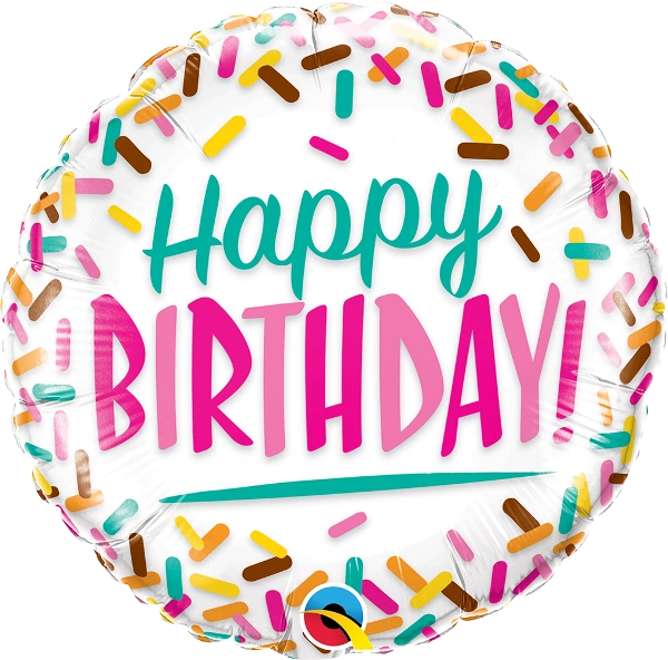Fóliový balónek ve tvaru kruhu s motivem posypu a nápisem narozenin.