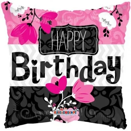 Fóliový balónek ve tvaru polštáře v růžové, černé a bílé barvě s potiskem květin a nápisem "Všechno nejlepší".