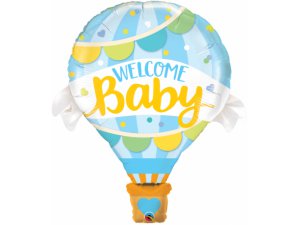 Fóliový balónek ve tvaru balónu v modré barvě a nápisem "Welcome baby".