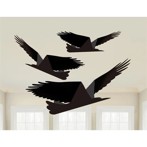 Tato sada obsahuje závěsné halloweenské dekorace ve tvaru havranů, které dokonale ozvláštní váš prostor. Tyto elegantní papírové figurky snadno zavěsíte nad dveře, na terasu nebo do pokojů, kde vytvoří mrazivou atmosféru – jako by zlověstně poletovali přítmí návštěv.
