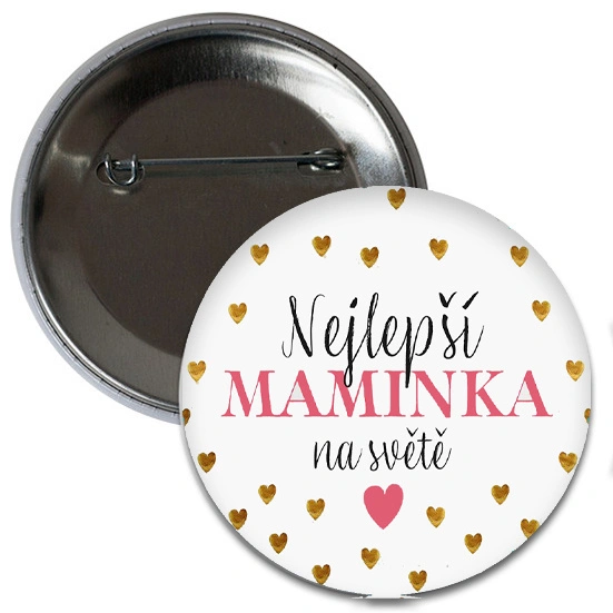 Motiv: bílá placka s černorůžovým nápisem NEJLEPŠÍ MAMINKA NA SVĚTĚ a zlatými srdíčky.