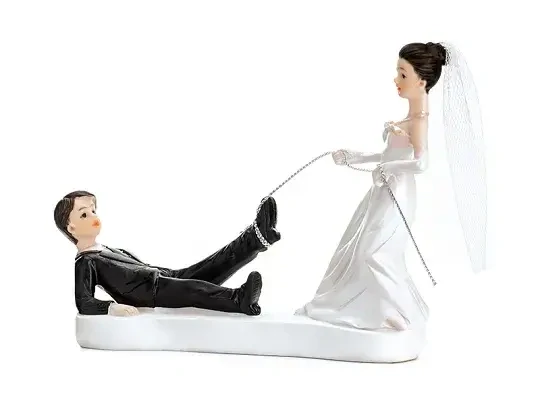 Svatební figurky ženicha a nevěsty v zábavné verzi, kdy má nevěsta ženicha uvázaného za nohu. Tato figurka dovede váš svatební dort k dokonalosti. Ozdoba na dort pro váš významný svatební den, která všechny okouzlí a pobaví.