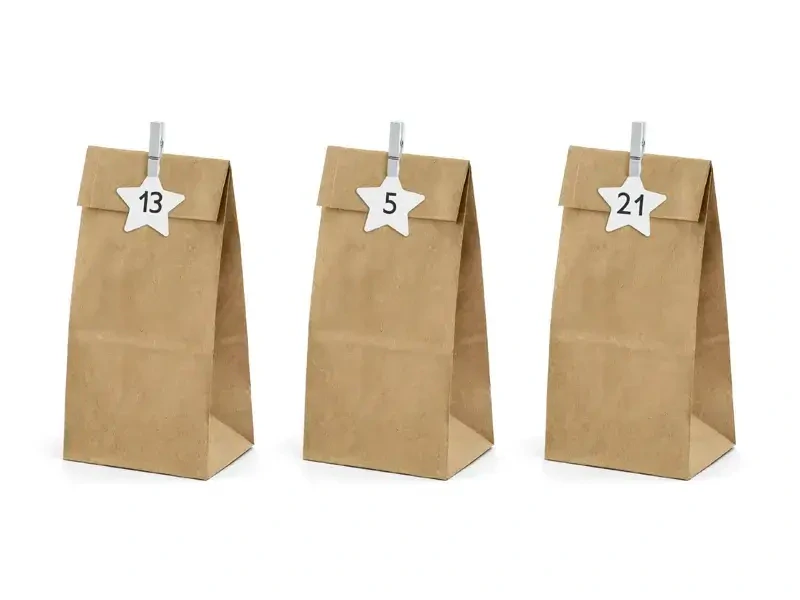 Balení: 24 x pytlíček ( 8 x 21 x 6,5 cm), 24 x hvězdička s číslem, 24 x bílé kolíčky