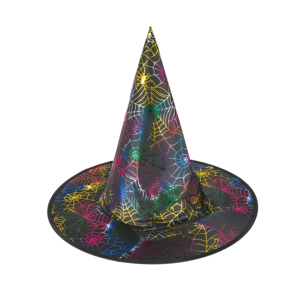 Veselý čarodějnický klobouk v černé barvě s motivem barevné holografické pavučiny. Ideální doplněk kostýmu na Halloween párty, karneval nebo pálení čarodějnic.