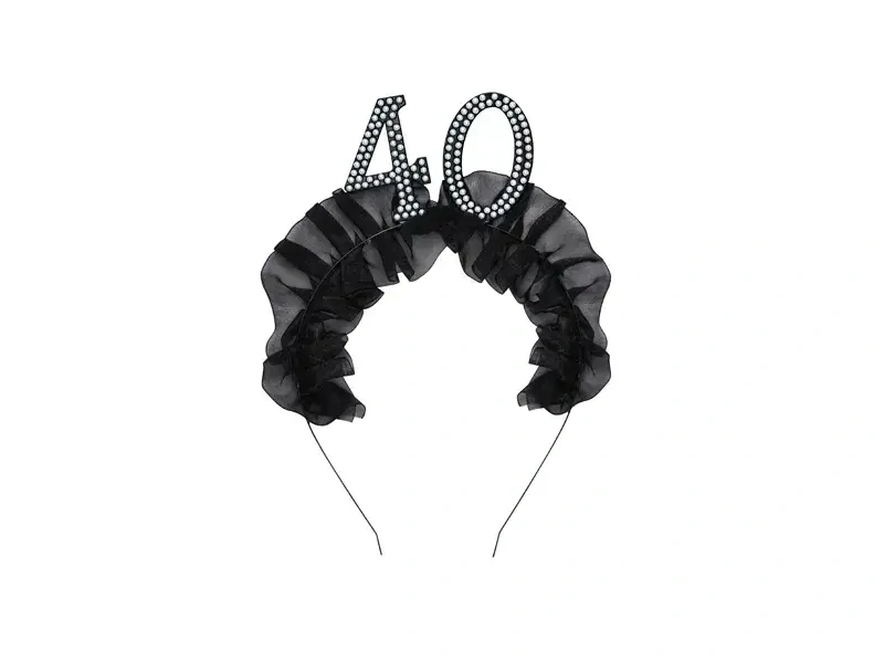 Party čelenka pro oslavence 40. narozenin, která je nutností. Elegatní v černé barvě s volánky s perličkovým efektem. Tento úžasný doplněk potěší oslavence, nebo bude skvělým doplněním fotokoutku.
