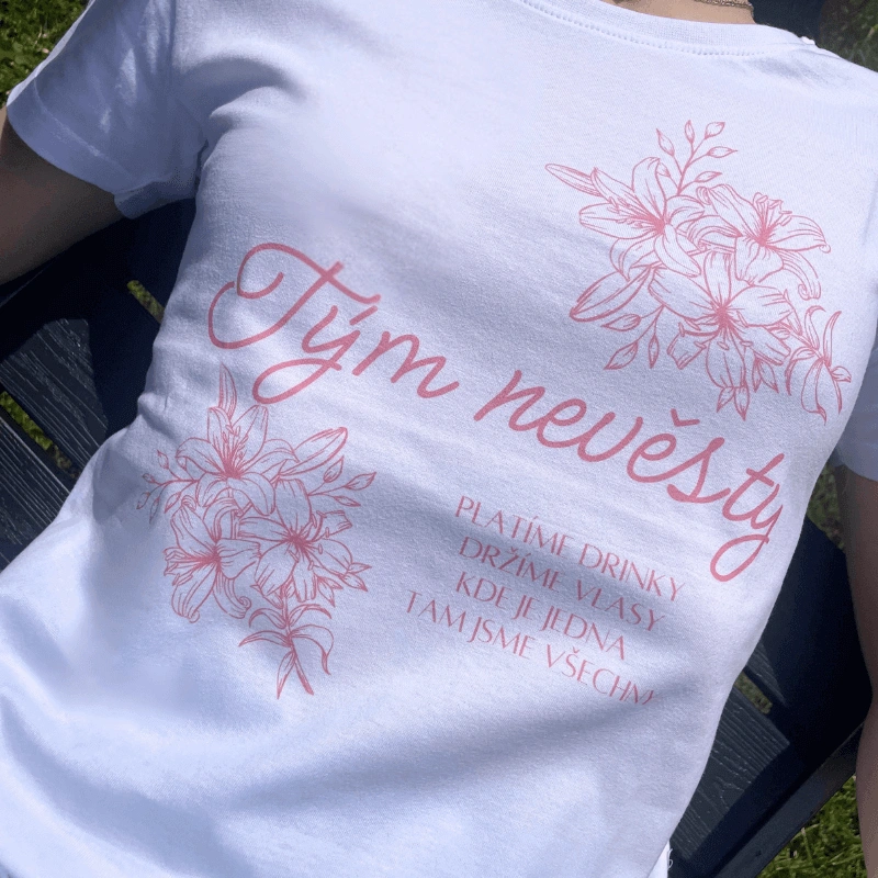 Originální trička na rozlučku se svobodou v bílé barvě s potiskem ve světle růžové. Dámské tričko má unikátní nápis v češtině Tým nevěsty a květinový vzor, který bude přesně to pravé pro všechny dámy na rozlučce. Doplněný o vtipný a mnohdy výstižný citát "Platíme drinky, držíme vlasy, kde je jedna, tam jsme všechny". Ukažte se světu jako jeden tým, který drží spolu. Skvělé na poslední svobodný den vaší nevěsty, nebo i jako dárek pro svědkyně a družičky.
