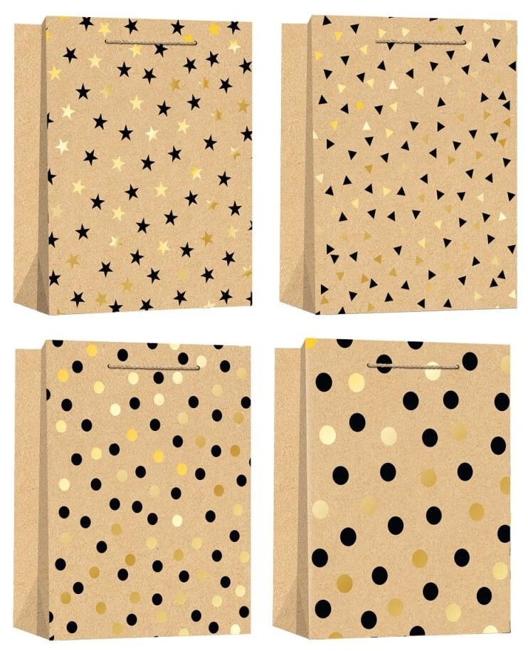 Dárková taška kraft se zlatými detaily se hodí na narozeniny, svátky, výročí, Vánoce, svatby i jiné slavnostní příležitosti, kde chcete dárku dodat elegantní vzhled.