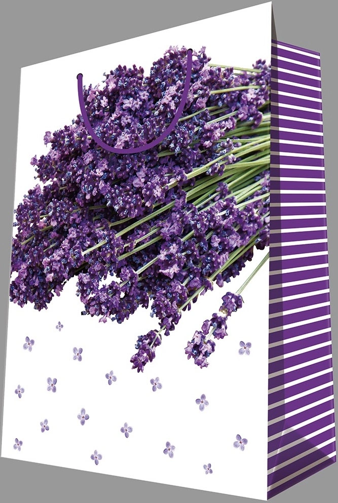 Kvalitní, papírová, dárková taška s motivem fialových květin.