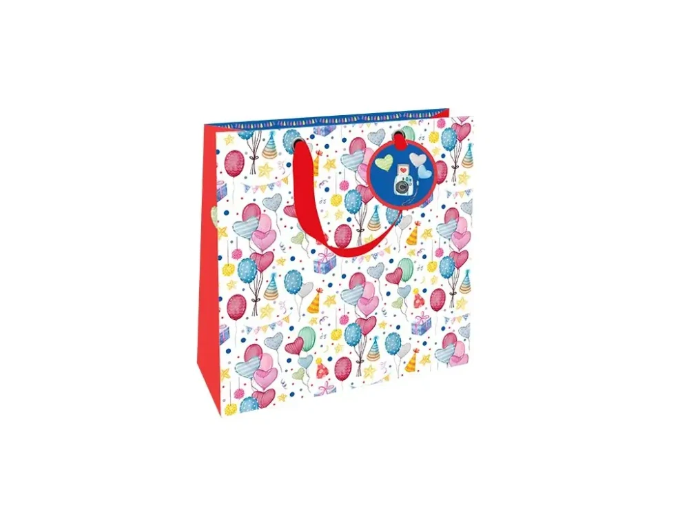 Stylová dárková taška s hravým potiskem srdíček, balónků, dárků a slavnostních detailů vnese do každého obdarování radostnou atmosféru. Kombinace jemných pastelových barev s výraznými červenými boky a uchy vytváří atraktivní kontrast, který zaujme na první pohled. Motiv je vhodný nejen pro narozeninové oslavy, ale také pro Valentýna, výročí nebo jiné příležitosti, kdy chcete vyjádřit radost a náklonnost.