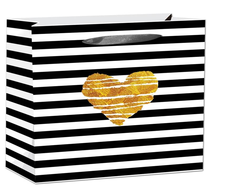Kvalitní, papírová, dárková taška s motivem pruhů a zlatého srdce.