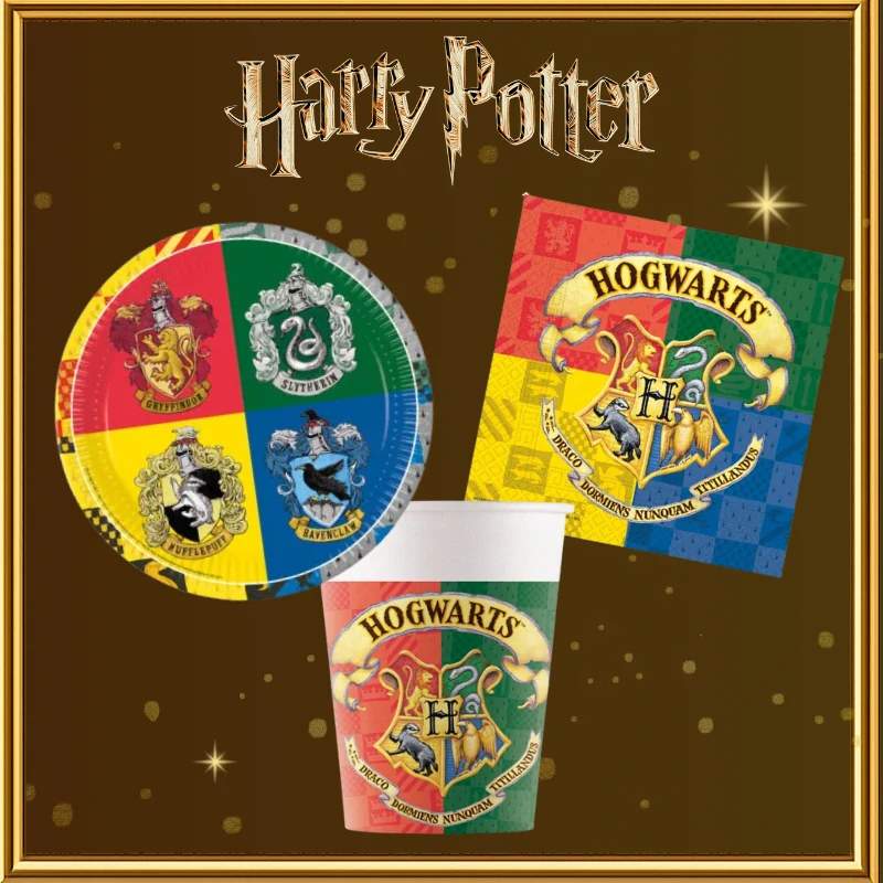 ∼ talíře 23 cm (8 ks), kelímky (8 ks), ubrousky (20 ks), banner Happy Birthday (2 m), fóliový balonek Nebelvír a Zmijozel, latexové balonky (8 ks), papírová brčka (4 ks), papírové čepičky (6 ks)