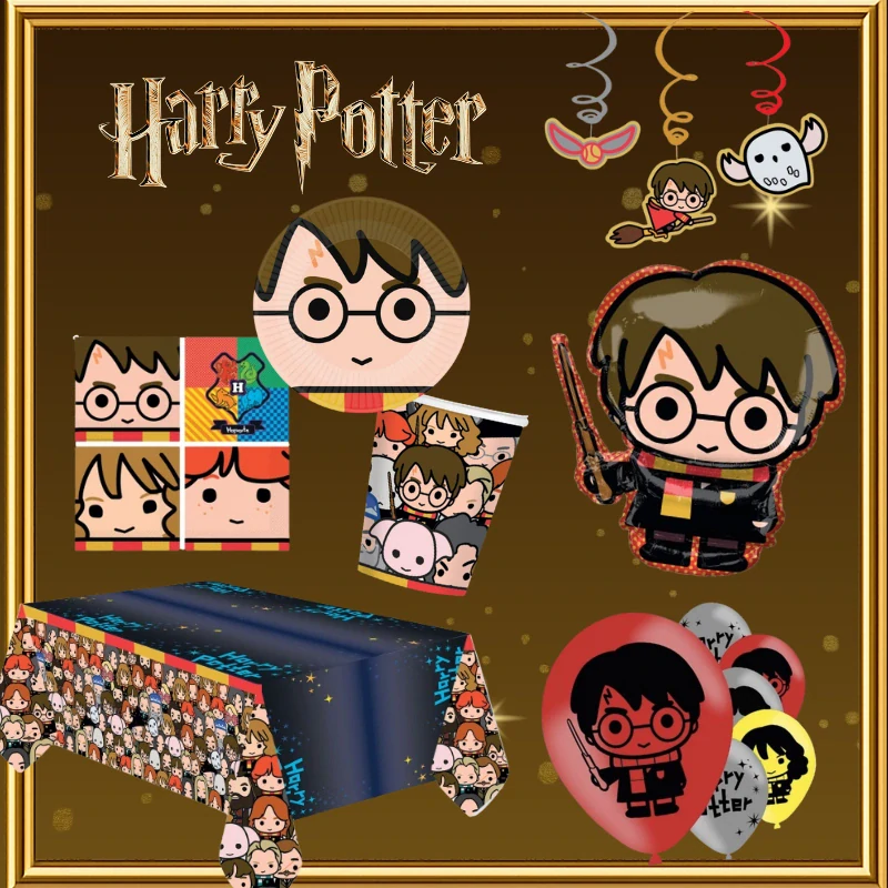 ∼ talíře 23 cm (8 ks), kelímky (8 ks), ubrousky (16 ks), závěsné spirály (6 ks), latexové balonky Harry Potter Fun (6 ks), plastový ubrus, fóliový balonek Harry Potter 78 cm