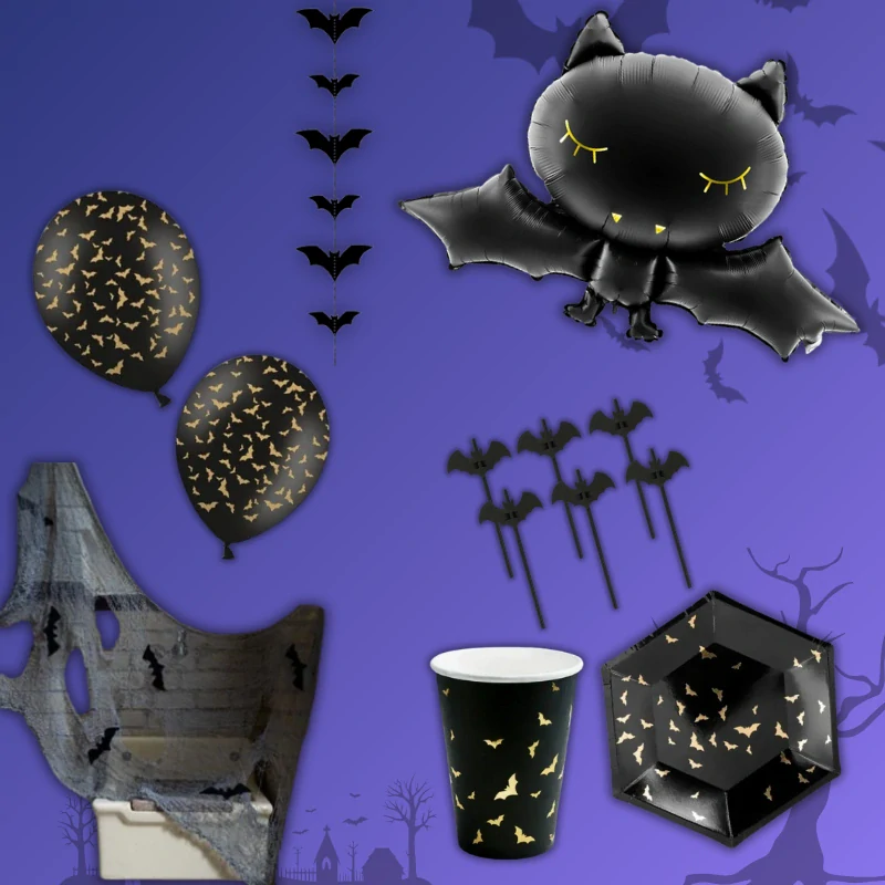 ∼ talíře 20 cm (6ks), kelímky (6ks), girlanda Netopýr černá, fóliový balónek Netopýr, latexový balonek Halloween černý s netopýry (12ks)