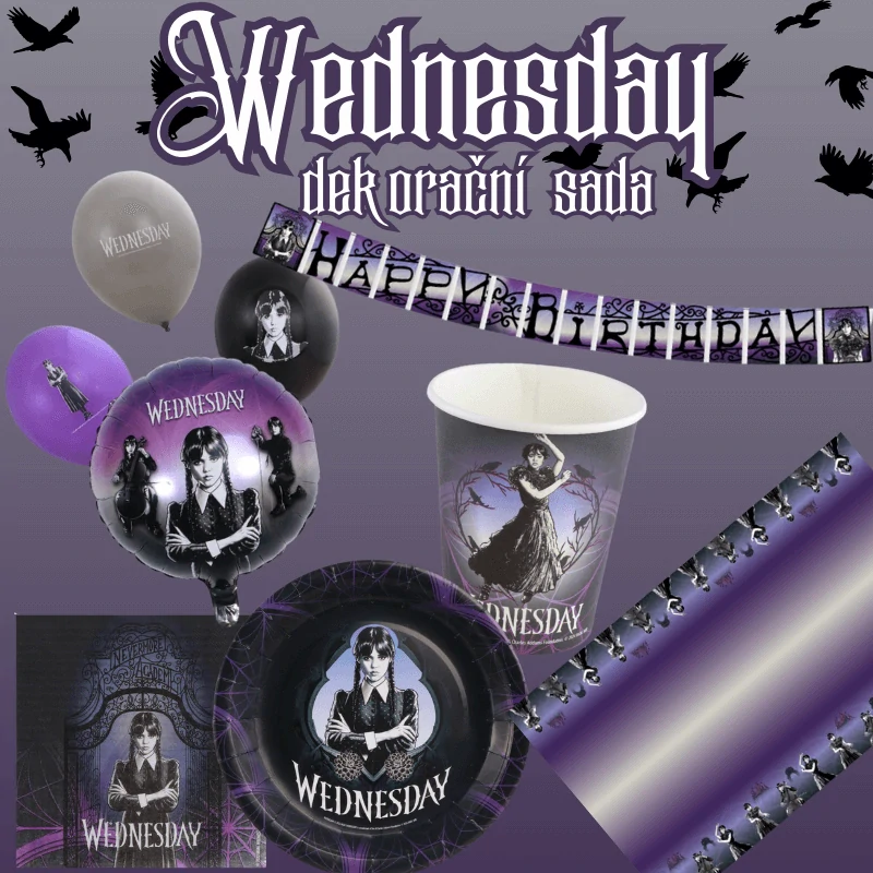∼ ubrousky (20ks), talíře (8ks), kelímky (8ks), fóliový balónek kruh 43cm, fóliový balonek postava 90cm, závěsná dekorace, brčka (8ks), ubrus, latexové balónky (sada s potiskem Wednesday- 1 balení 6ks)