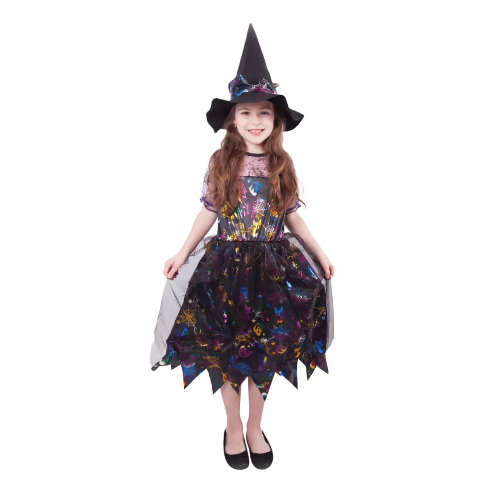 Krásný čarodějnický kostým s motivem pavučin v pestrých barvách a holografickým efektem. Černé šaty se zubatou sukní jsou zdobeny pavučina, dýněmi a různymi halloweenskými prvyk v duhových barvách. Součástí balení je také sladěný klobouk, který je rovněž zdoben stříbrnou stuhou.