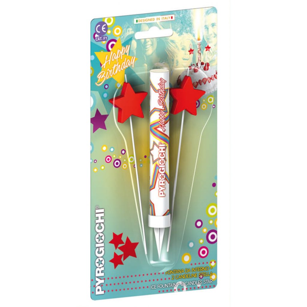 Barevná fontánka na dort v sadě se 2 svíčkami ve tvaru hvězdiček. Vhodné do interiéru nejen na dort, ale i na zmrzlinový pohár, do držáku svíčky nebo se může jenom držet v ruce za spodní část.
