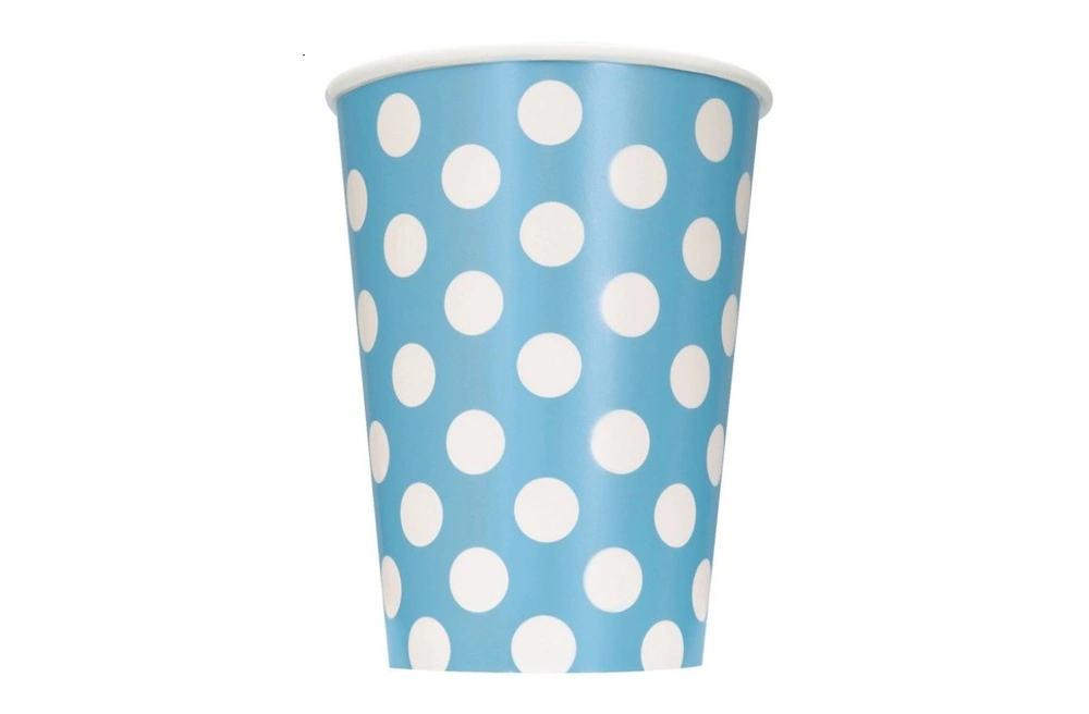 Papírové kelímky v barvě modré s bílými puntíky. Určeno pouze pro studené tekutiny. Obsah kelímku je 270ml.