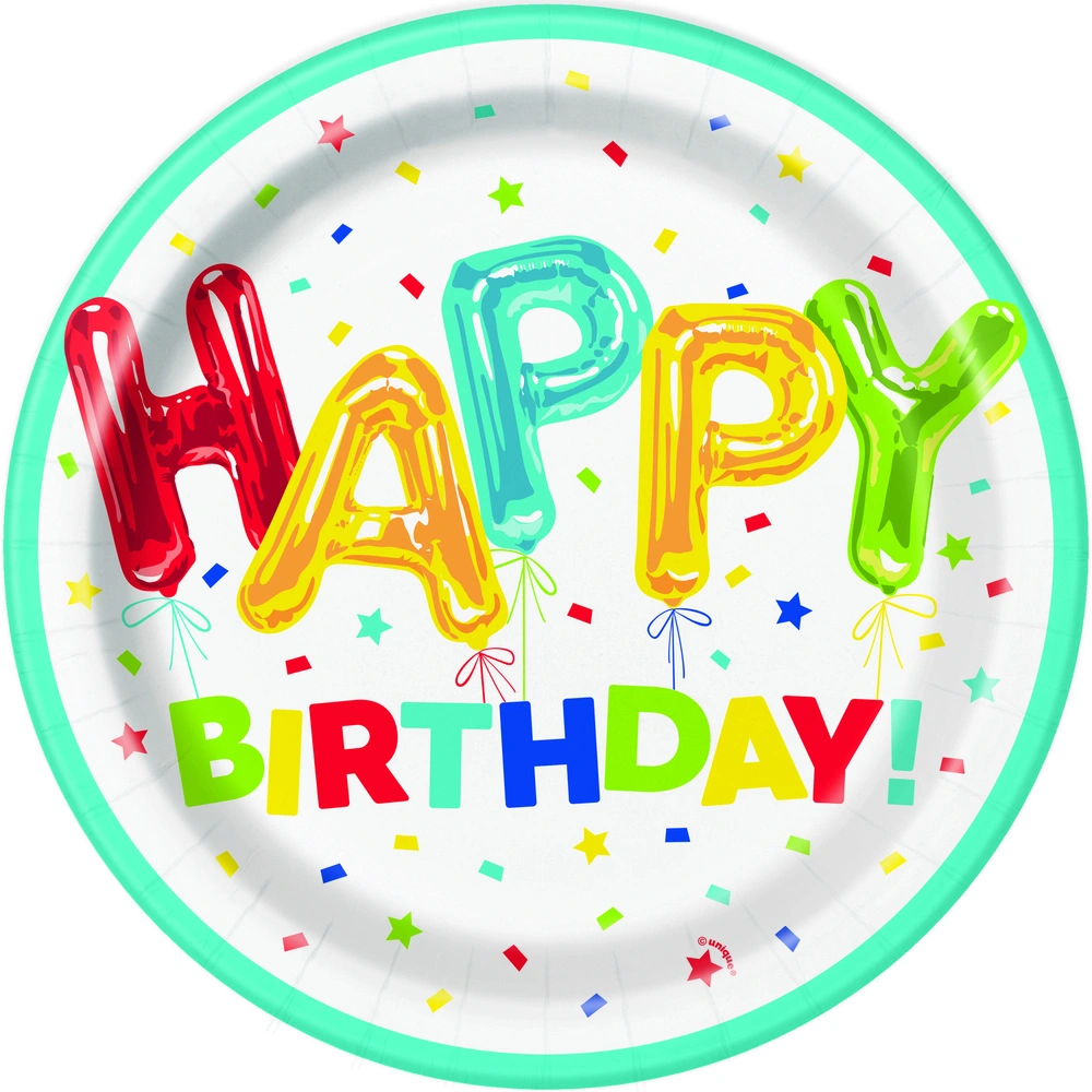 Sada osmi papírových talířků o průměru 23cm s barevným potiskem Happy birthday!.
