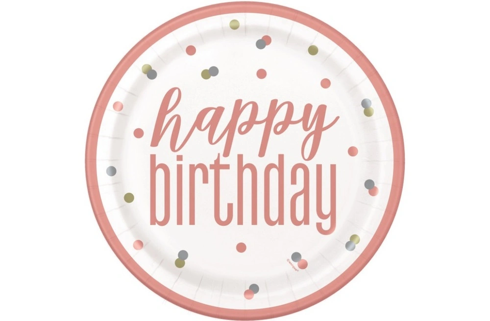 Sada osmi papírových talířků o průměru 23cm s potiskem Happy birthday v rosegold barvě.