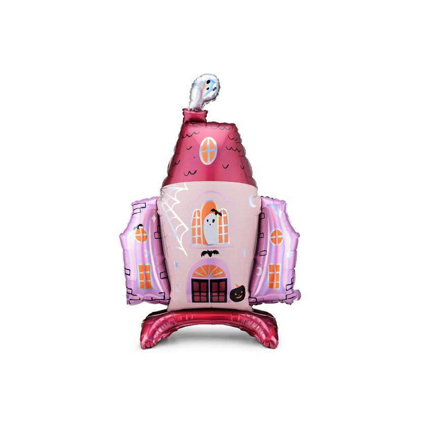 Stojící foliový balonek s halloweenským motivem. Strašidelný dům v růžové barvě. Nepostradatelná dekorace na Halloween.