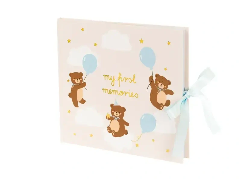 Fotoalbum v krémové barvě, zlatým nápisem My first memories (Moje první vzpomínky) s roztomilým hnědým medvídkem pro všechny malé holčičky i chlapečky. Predevším si ale kombinace hnědé, bílé a světle modré oblíbí maminky chlapečků. Rozkošný medvídek je dozdoben čepičkou, balónkem a zlatými hvězdičkami. Pro vaše originální vzpomínky, příběhy, přání a hlavně fotografie se uvnitř nachází velké množství stran, tak neváhejte a popusťte uzdu fantazie. Nezapomeňte dozdobit stránky samolepkami, které najdete v balení.