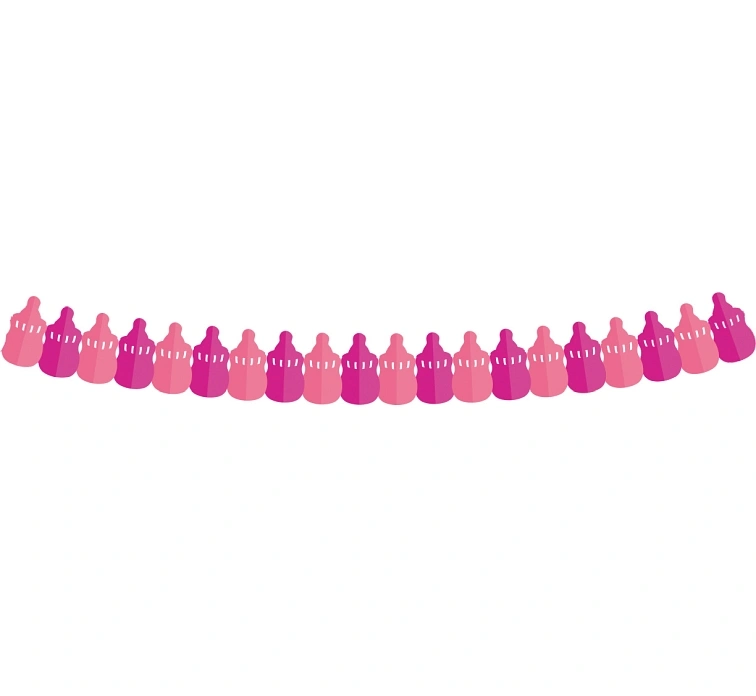 Papírová duhová girlanda znázorňující růžové lahvičky pro kojence. GIrlanda je oboustranná. Jednotlivé láhve jsou k sobě uvázány tenkou, pevnou nití. Délka 3,6m - upevňuje se pomocí provázků.