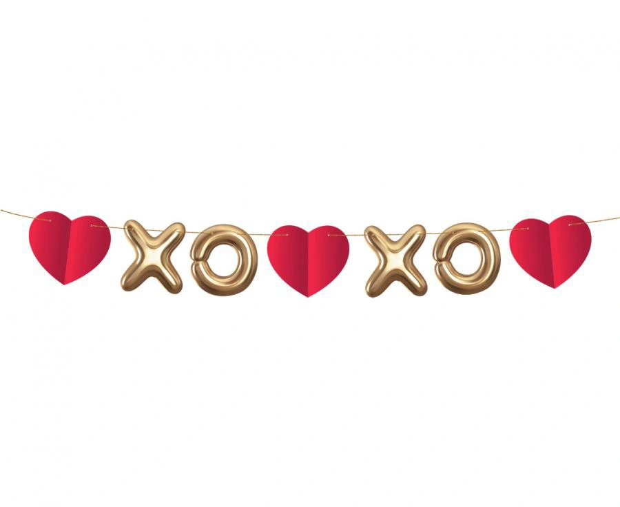 Papírová girlanda s nápisem XOXO a se srdíčky.