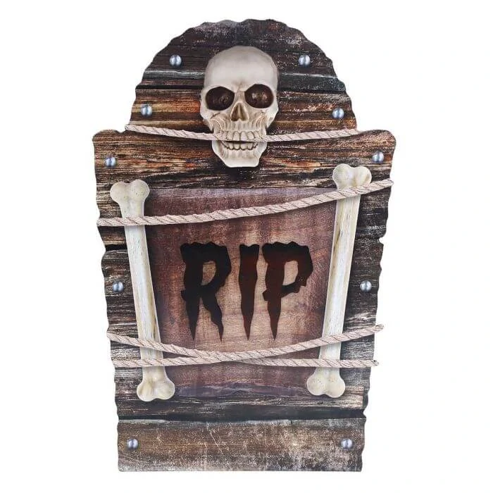 Dekorace plastová cedule náhrobek R.I.P s kostlivcem, který dodá smrtelný efekt vaší halloweenské party. Jednoduchá dekorace, kterou můžete pověsit, položit do trávníku nebo zakombonovat do vaší stolové dekorace.