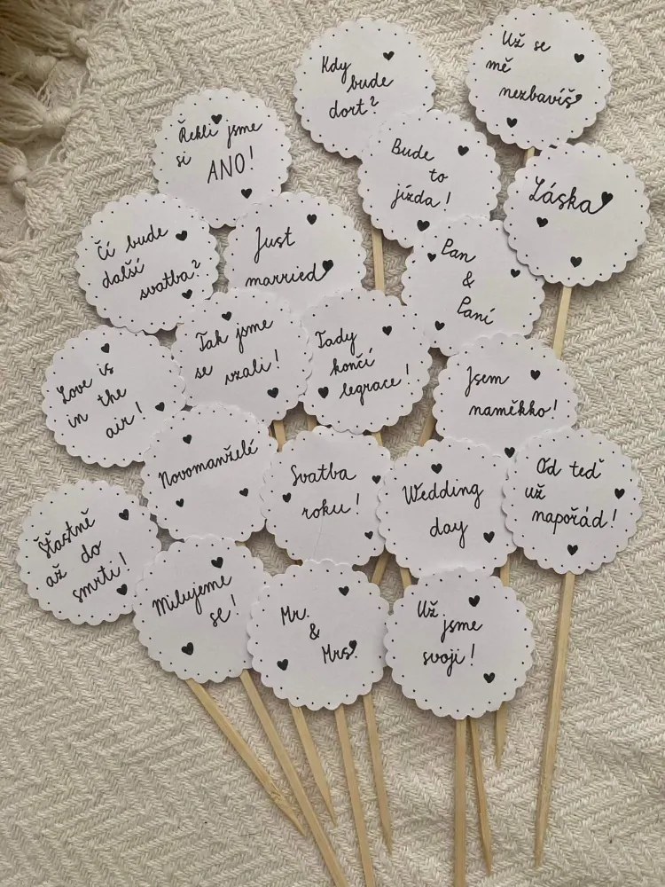 Originální ručně vyráběná napichovátka z České republiky se svatebním motivem jsou unikátní doplňkem na váš speciální den. Nejen, že se jedná o skvělou dekoraci k mňamkám, které chystáte, ale díky českým nápisům je to osobní prvek. Jenom tak je u někoho neuvidíte a v češtině už vůbec ne. Jednoduchá dekorace bez starostí a určitě mile všechny překvapí.