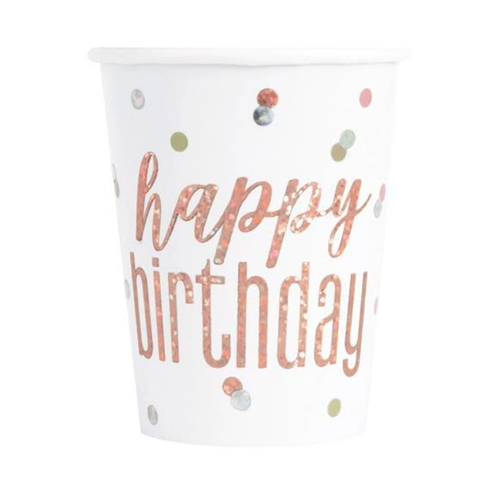 Papírové kelímky v bílé barvě s rosegold nápisem Happy birthday a puntíky, určeno pouze pro studené tekutiny. Obsah kelímku je 270ml.
