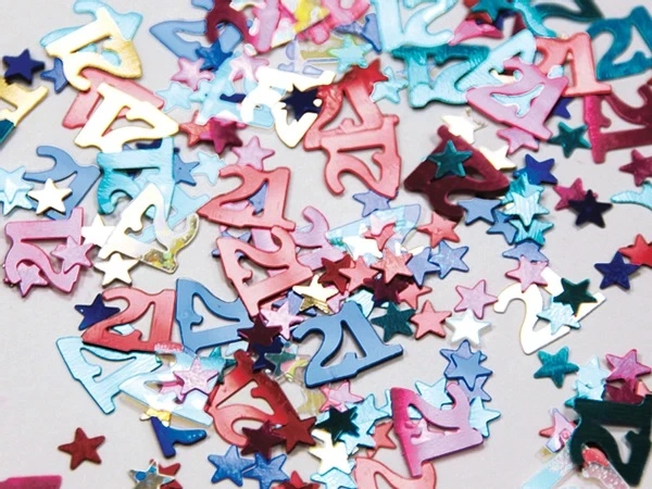 Konfety ve tvaru hvězd a čísla 21 v barevném mixu skvěle oživí Vaši oslavu.
