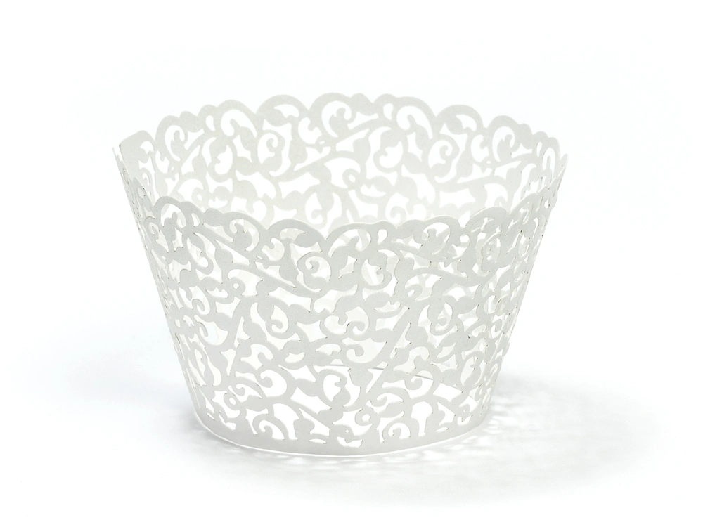 Košíček na cupcake v bílé barvě ornamentový. Velikost po složení je 5.5x8.5 cm.