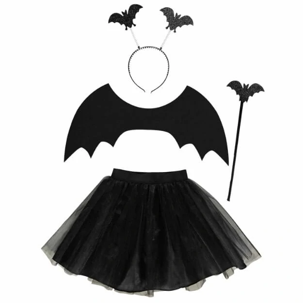 Univerzální kostýmový set na motivy netopýra pro dívky na karnevaly nebo jiné oslavy. Součástí setu jsou sukýnka, čelenka s netopýry, kouzelná hůlka a netopýří křídla. Vše v černé barvě, takže kostým snadno sladíte. Ideální na Halloweenské party, karnevaly a tématické večírky. Jednoduchý kostým, který nezklame na žádné party.
