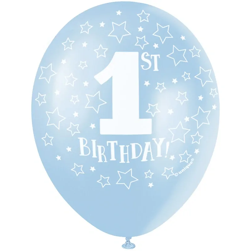Latexové balonky na oslavu 1. narozenin vaše malého prince. Balonky jsou světle modré barvy s bílým nápisem "1st Birthday" a bílými hvězdičkami. Zaručeně s nimi vykouzlíte jednoduchou a roztomilou dekoraci na narozeninovou oslavu.