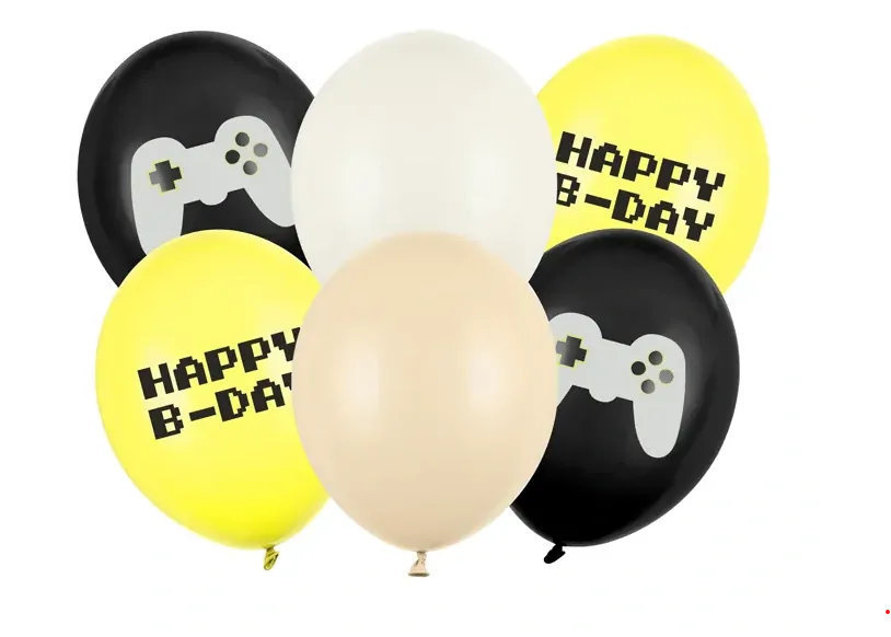 Latexové balonky v černé, žluté neonové a béžových barvách s motivem Gamer a obrázkami s ovladačem a nápisem Happy B-Day. Připravte oslavu, nebo party pro správné gamery se vším všudy.