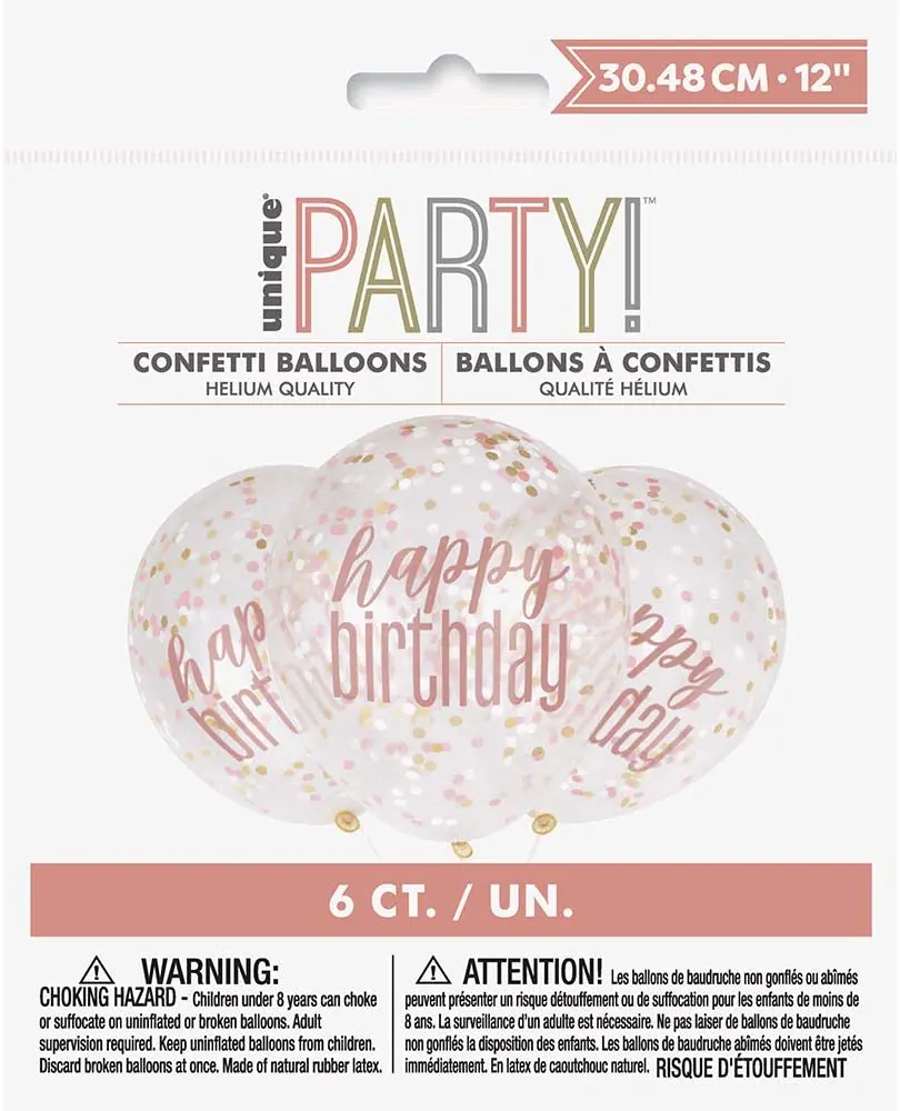 Latexové balónky průhledné s rosegold potiskem "Happy Birthday" a s růžovostříbrnými konfetami. Dolaďte narozeninovou oslavu těmito roztomilými balónky a vykouzlete tak úsměv na tváři oslavenkyně.