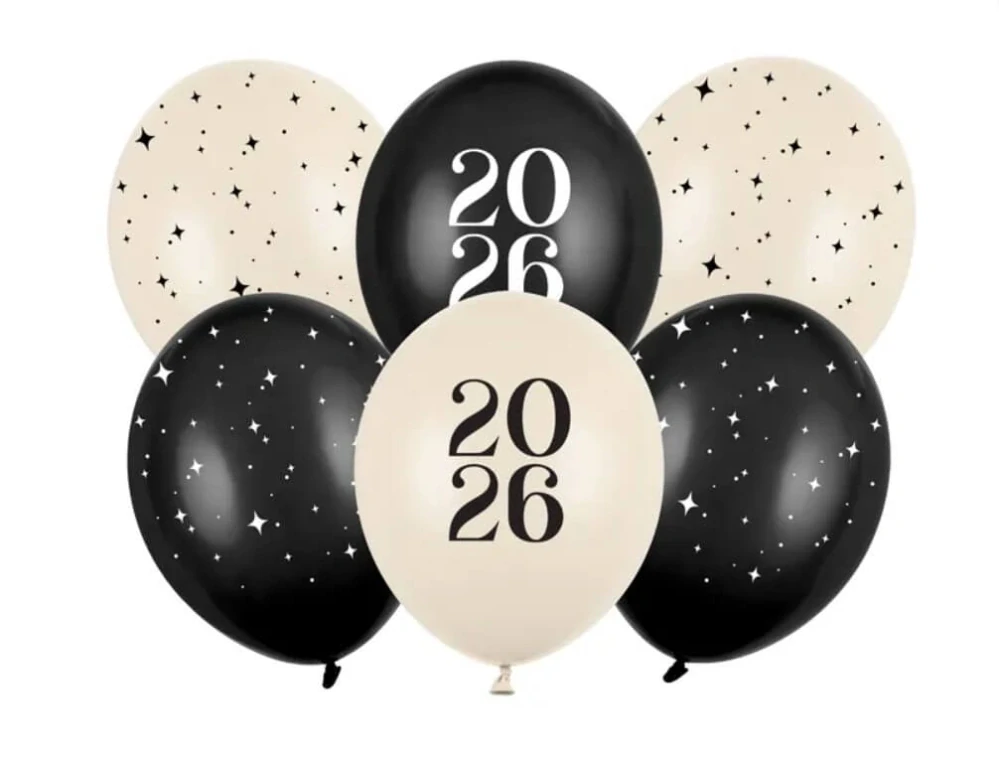 Přivítejte nový rok stylově! Latexové balonky v béžovo černém provedení snadno sladíte s vaší výzdobou. Balonky oslavují nový nadcházející rok 2026 na zbývajících baloncích je potisk hvězd pro slavnostní efekt. Tyto balonky jsou skvělou dekorací pro silvestrovské oslavy nejen na velkých slavnostech, ale i pro domácí party.