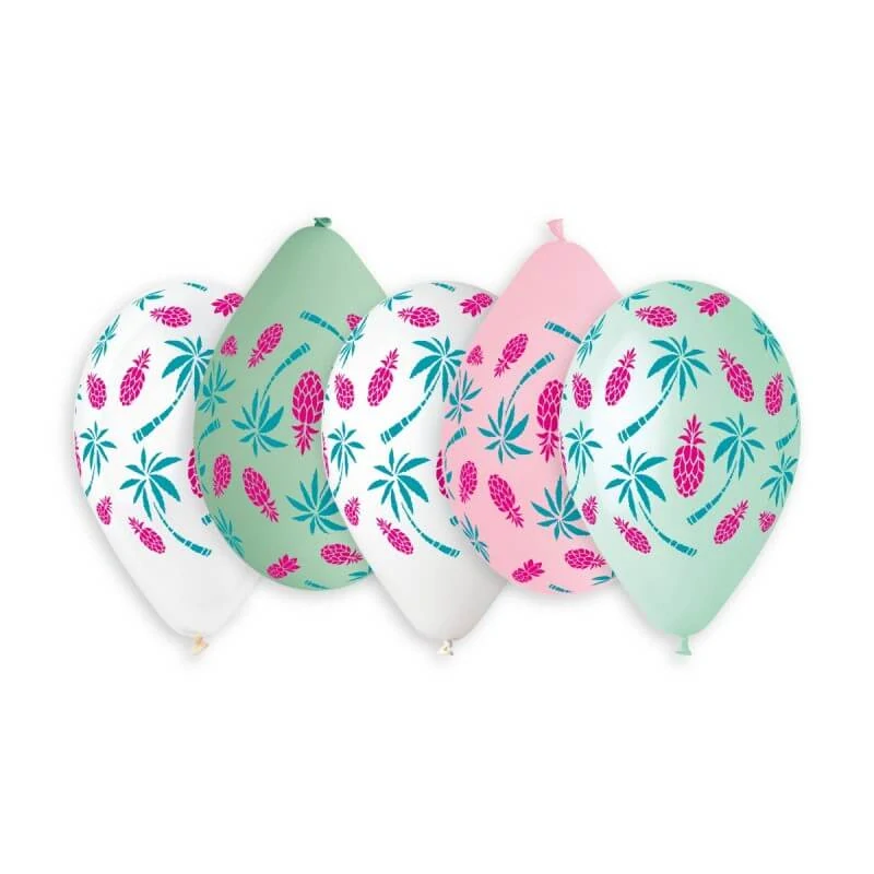 Vneste do své oslavy letní atmosféru s tímto tropickým latexovým balónkem zdobeným veselým vzorem zelených palem a červených ananasů.