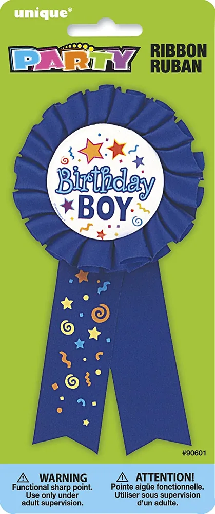 Narozeninová brož v modré barvě s nápisem "Narozeninový chlapec"