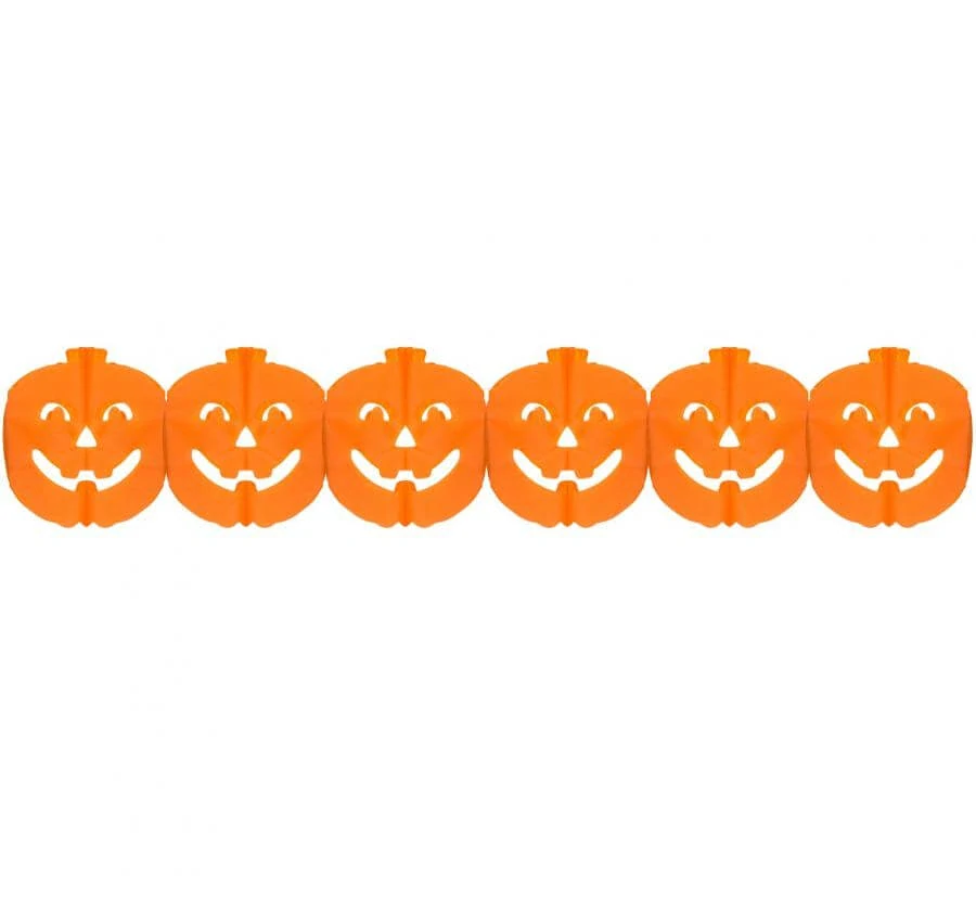 Papírová girlanda veselé dýně v oražové barvě rozveselí každou halloweenskou party. Dekorace se hodí především na dětské halloweenské oslavy. Jednoduché na sestavení a vyzdobení, ale děti určitě potěší a nebudou se bát. Jednoduše se kombinuje s dalšími dekoracemi.