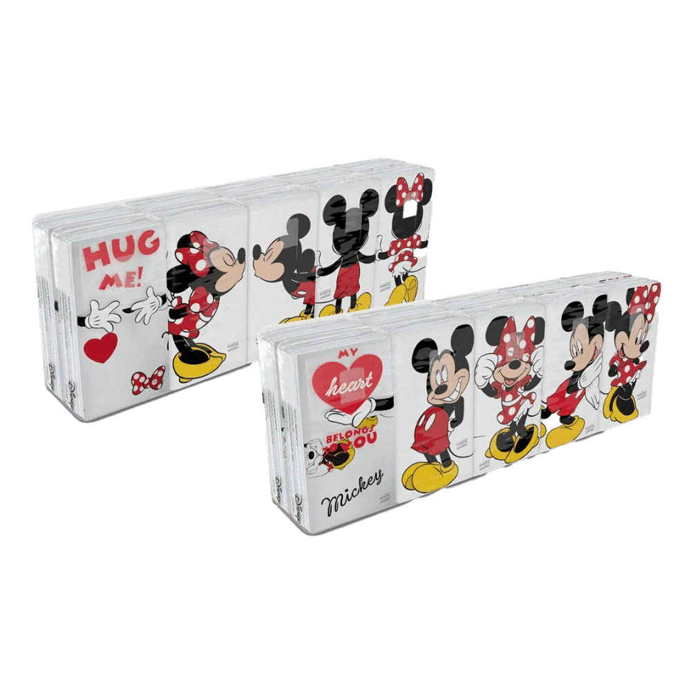 Papírové kapesníky s motivem oblíbených postaviček Minnie a Mickeyho budou to pravé pro všechny zamilované nebo děti, ať už je zima, či léto. Díky malým balíčkům lze jednotlivé sáčky přibalit pro jakoukoliv příležitost. Samotné třívrstvé ubrousky mají barevný potisk.