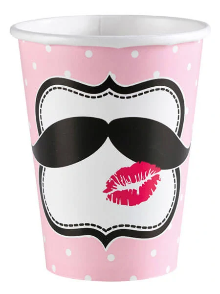 Tyto papírové kelímky s motivem knírků jsou perfektním doplňkem pro tematické oslavy všech věkových kategorií. Elegantní růžovo-černý design s puntíky a ikonickými knírky působí hravě i stylově zároveň a skvěle zapadne do party ve stylu knírků.