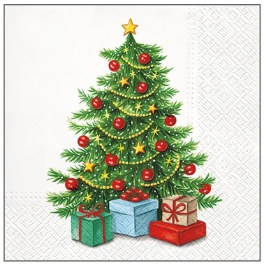 Třívrstvé papírové ubrousky s motivem vánočního stromečku, pod kterým jsou již nadělené dárky.