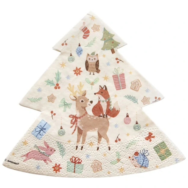 Roztomilé papírové ubrousky ve tvaru stromečku s motivy zvířátek zimního lesa a dalších vánočních detailů dodají vašemu svátečnímu stolu tu správnou atmosféru. Jsou ideální pro vánoční večeře, setkání s rodinou i slavnostní posezení s přáteli. Praktické, milé a jednoduché – doladí výzdobu a zároveň poslouží při servírování. Doplnit je můžete o talíře a kelímky ve stejném motivu.