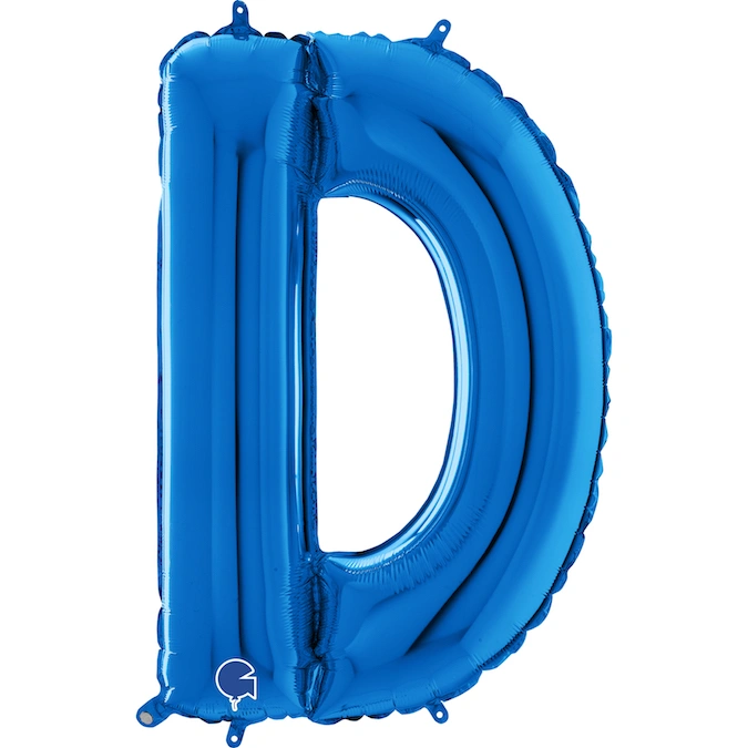 Fóliový balónek ve tvaru písmene D v modré barvě. Balónek je ideální na oslavy, kde může znázornit spolu s dalšími písmeny jméno oslavence. Hodí se samozřejmně i na výročí a různé oslavy.
