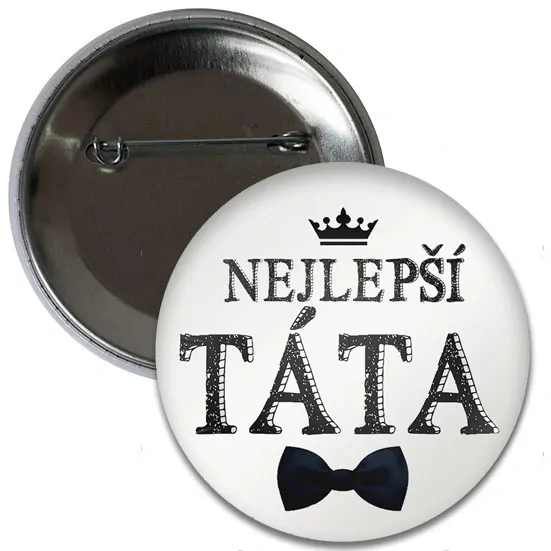 Motiv: černý nápis NEJLEPŠÍ TÁTA, bílá placka s korunkou nad nápisem a motýlkem pod nápisem.