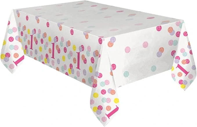 Tento plastový ubrus k 1. narozeninám je praktickým i dekorativním doplňkem pro oslavu prvních narozenin holčičky. Bílý podklad zdobený růžovými puntíky, balónky a výraznou číslicí 1 vytváří jemnou, slavnostní atmosféru, která krásně doladí narozeninový stůl.
